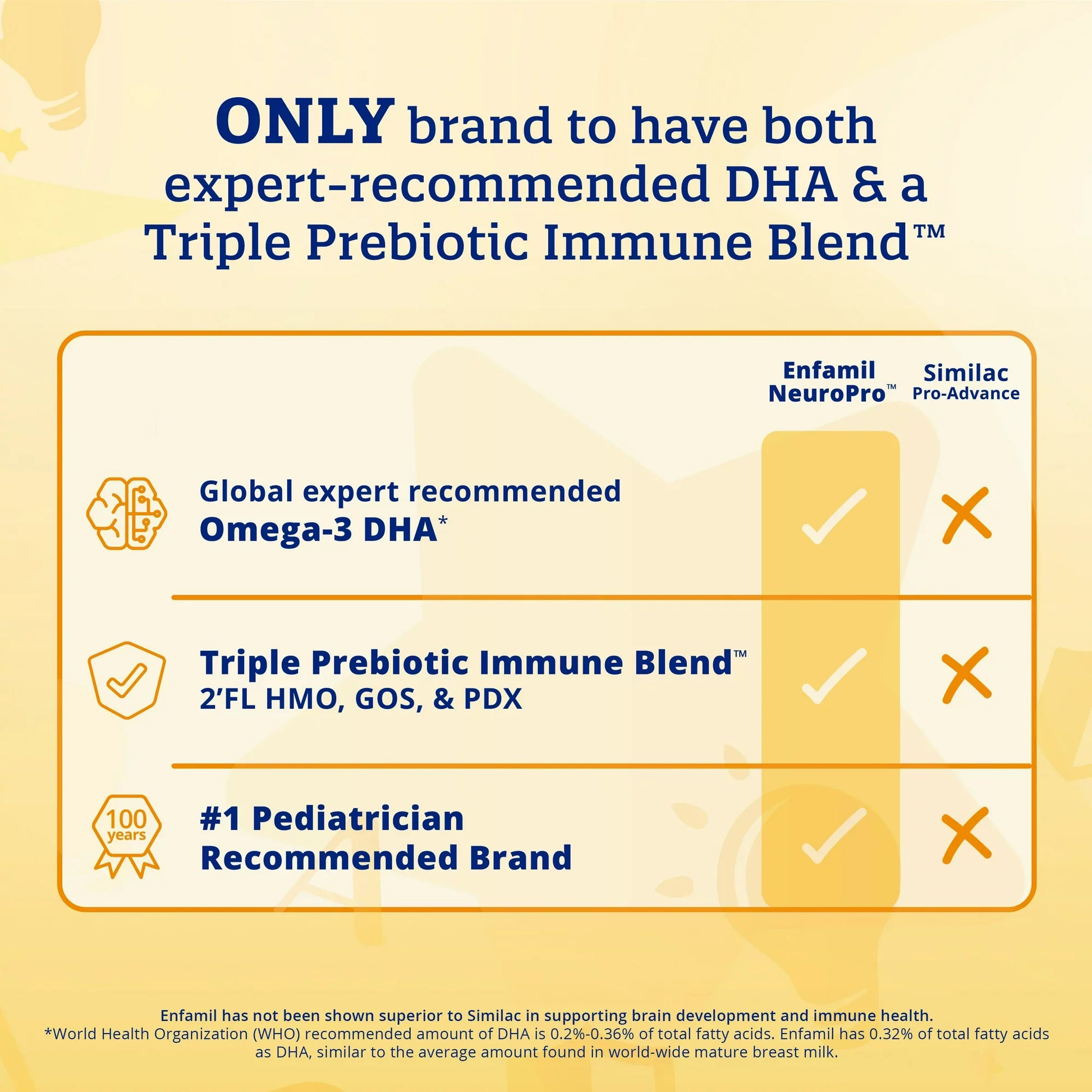 The yellow can from Enfamil that we sell is their standard formula product for the mass market. Some will be called Neuropro product lines, and other yellow cans are not. Being part of the Neuropro product line means the formula has a slight ingredient tweak to help promote brain development that the traditional ones do not have.